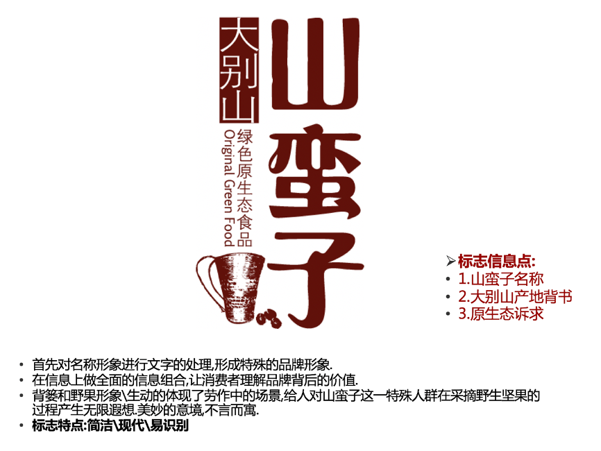 經(jīng)過與大別山生態(tài)農(nóng)業(yè)的深度溝通,高層對集團層面的“企業(yè)LOGO”標識已經(jīng)有想法了,項目組在“承接高層意志”的基礎(chǔ)上點亮了品牌核心價值,建議其圍繞“大別山”強化標識認知,強化“原生態(tài)”價值,取得了公司高層的一致認可。