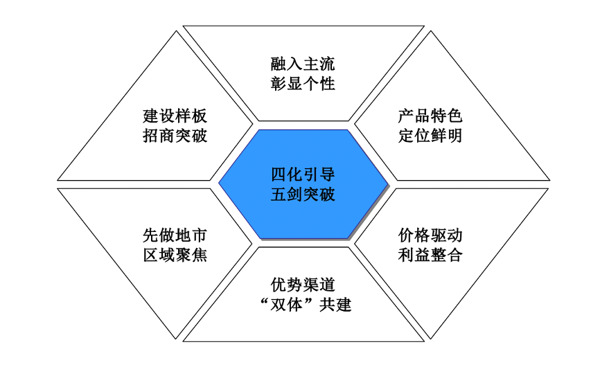 在“公司發(fā)展戰(zhàn)略規(guī)劃”指引下,項目組創(chuàng)新制訂大別山公司的總體營銷策略是——“四化引導、五劍突破”,強化年度營銷策略制訂,建議企業(yè)積極融入主流農(nóng)產(chǎn)品,強化產(chǎn)品特色、價格渠道和全渠道拓展,聚焦地市做突破,建立樣板做招商。