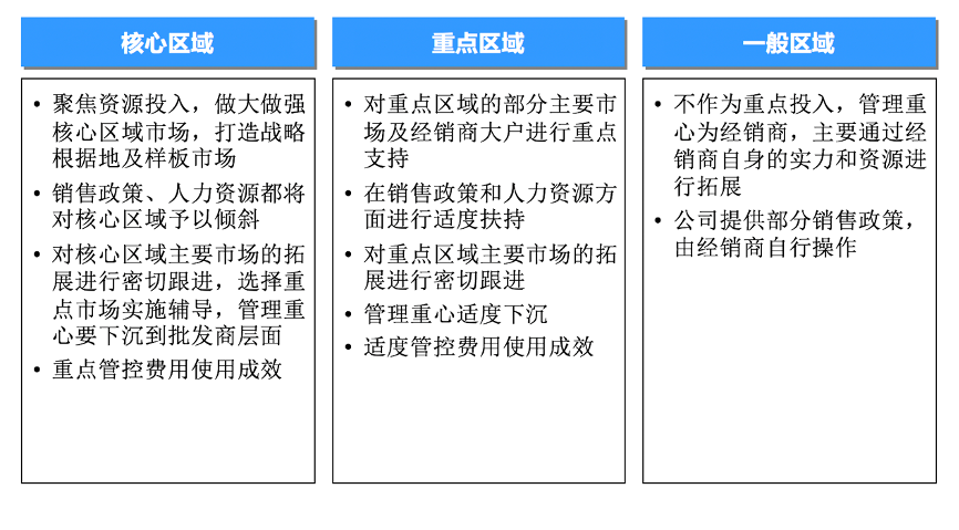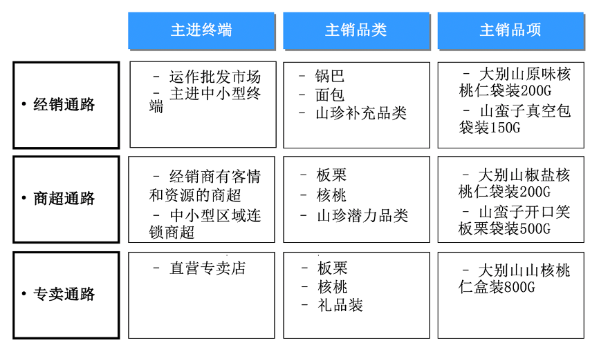 2)大別山食品區(qū)域市場可劃分為核心區(qū)域、重點區(qū)域和一般區(qū)域,再針對不同區(qū)域劃分出不同城市,針對不同區(qū)域及城市采取不同政策,前期核心區(qū)域以六安等安徽市場為主,中期強化長江以北市場的“全渠道分銷”,后期強化“全國化擴張”。