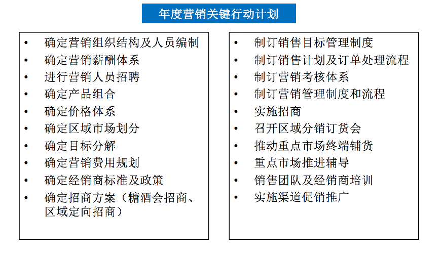 制訂“年度營銷關(guān)鍵行動計劃”,將年度營銷策略落地到各個月度及各周,強化組織的督導執(zhí)行
