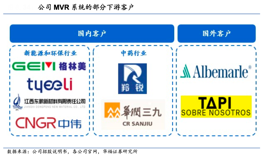 經(jīng)典案例:根據(jù)公司招股說明書、各公司官網(wǎng)、華福證券研究所等綜合資訊表明,亞光股份公司的 MVR 系統(tǒng)在新能源、環(huán)保、中藥行業(yè)的應(yīng)用案例豐富, 已順利服務(wù)格林美、羚銳制藥、華潤三九、Albemarle Lithium Pty Ltd等國內(nèi)外龍頭,由于 MVR 系統(tǒng)屬于高度定制化裝備,因此客戶一旦選中供應(yīng)商一般不會輕易更換,公司已積累的客戶有望具備較強(qiáng)粘性。