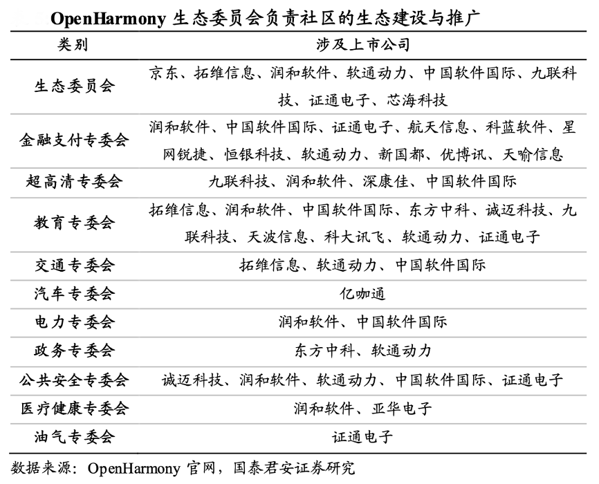 經(jīng)典案例:根據(jù)OpenHarmony官網(wǎng)、國泰君安證券研究等綜合資訊表明,OpenHarmony 生態(tài)委員會負責 OpenHarmony 開源生態(tài)建設與推廣, 目前委員單位包括華為、京東、開鴻智谷(拓維信息)、潤和軟件、軟通動力、深開鴻(中國軟件國際)、九聯(lián)科技、證通電子、芯??萍季偶?。生態(tài)委員會下設金融支付、超高清、教育、交通、汽車、電力、政 務、公共安全、游戲、醫(yī)療健康、油氣等產(chǎn)業(yè)專委會,由各產(chǎn)業(yè)鏈主管 單位、設備廠商、應用廠商、客戶等構(gòu)成,其中涉及到的上市公司統(tǒng)計如下: