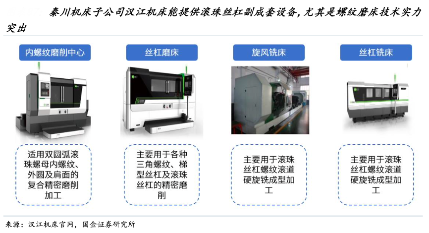 經(jīng)典案例:根據(jù)漢江機(jī)床官網(wǎng)、國金證券研究所等綜合資訊表明,秦川機(jī)床子公司漢江機(jī)床為國內(nèi)螺紋磨床主導(dǎo)企業(yè),能夠提供滾珠絲杠副成套設(shè)備,2022 年漢江機(jī)床營業(yè)收入 4 億元(除磨床外還直接銷售滾動(dòng)功能部件)。子公司格蘭德在磨床 領(lǐng)域也開發(fā)了外圓磨床、萬能外圓磨床、端面外圓磨床、軸承磨床、球面磨床、外圓系列 數(shù)控磨床、汽車及工具行業(yè)專用磨床等 11 大類、110 多個(gè)品種、150 多個(gè)規(guī)格。