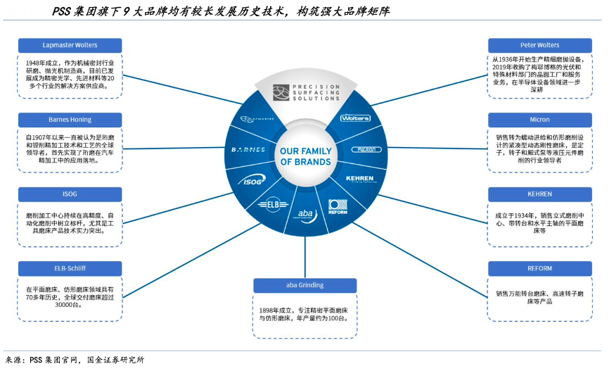 經(jīng)典案例:根據(jù)PSS集團微信公眾號、國金證券研究所等綜合資訊表明,美國 PSS(Precision Surfacing Solutions)集團,作為全球最大的超精密機床生產(chǎn)制造商之一,旗下?lián)碛衼碜杂诘聡?、瑞士、?國、英國及荷蘭的多個百年品牌。集團產(chǎn)品涵蓋了半導體晶圓設備、多線切割設備、研磨、 拋光、雙端面磨床、強力成形磨、平面成形磨、去毛刺機、立式磨削中心、葉尖磨、內(nèi)外圓磨及耗材。為全球超過 9000 個客戶提供精密加工解決方案。