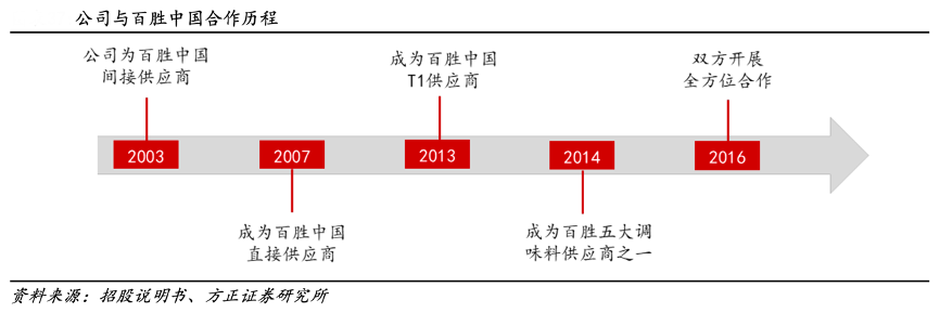 經(jīng)典案例:根據(jù)招股說明書、方正證券研究所等綜合資訊表明,寶立食品公司與百勝中國合作近 20 年,2016 年以來,雙方已開展全方位的合作,公司服務(wù)百勝中國下屬所有品牌,參與百勝中國新品開發(fā)、菜單設(shè)計等,產(chǎn)品延伸到腌料、撒粉、調(diào)味醬、沙拉醬、果醬、調(diào)理包、飲品小料和百勝新零售的輕烹食品等多個品類。