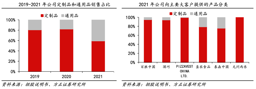 經(jīng)典案例:根據(jù)招股說明書、方正證券研究所等綜合資訊表明,2019年和2020年,寶立食品公司收入中超過80%均為定制品,說明公司定制化程度高,可以為大 B 客戶根據(jù)自身場景量身定制新品,利于提升各大連鎖餐飲品牌推新速度,公司憑借此優(yōu)勢與客戶建立了長期穩(wěn)定的合作關(guān)系。