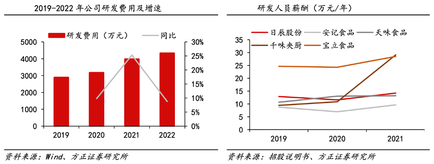 經(jīng)典案例:根據(jù)wind、招股說明書、方正證券研究所等綜合資訊表明,寶立食品公司重視研發(fā)能力的培養(yǎng),建立了完善的研發(fā)體系,并且注重對研發(fā)人員的激勵,研發(fā)人員薪酬在同行業(yè)公司中保持較高水平。作為研發(fā)驅(qū)動的食品風味及產(chǎn)品解決方案服務商,公司已積累大量配方數(shù)據(jù),可在經(jīng)典配方基礎(chǔ)上迭代創(chuàng)新,形成了強大的技術(shù)經(jīng)驗壁壘。