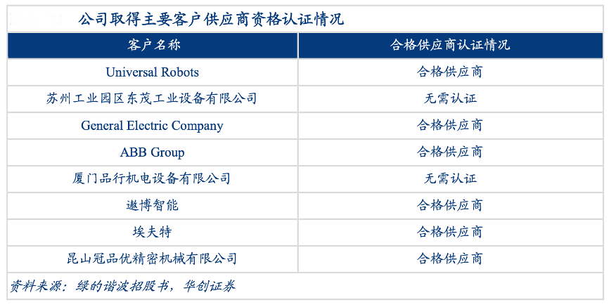 經(jīng)典案例:根據(jù)綠的諧波招股書、華創(chuàng)證券等綜合資訊表明,綠的諧波公司自主研發(fā)的精密諧波減速器推向市場(chǎng)后,經(jīng)過多家機(jī)構(gòu)和企業(yè)的檢測(cè)試用,在精度、 壽命、穩(wěn)定性、噪音等方面,均達(dá)到國內(nèi)領(lǐng)先水平。除了實(shí)現(xiàn)向國內(nèi)主流機(jī)器人廠商穩(wěn)定供貨外,公司產(chǎn)品也取得了諸如 Universal Robots、Kollmorgen、Varian Medical System 等國際知名廠商的認(rèn)可,并實(shí)現(xiàn)了向國際主流機(jī)器人廠商之一 Universal Robots 批量出口供貨。