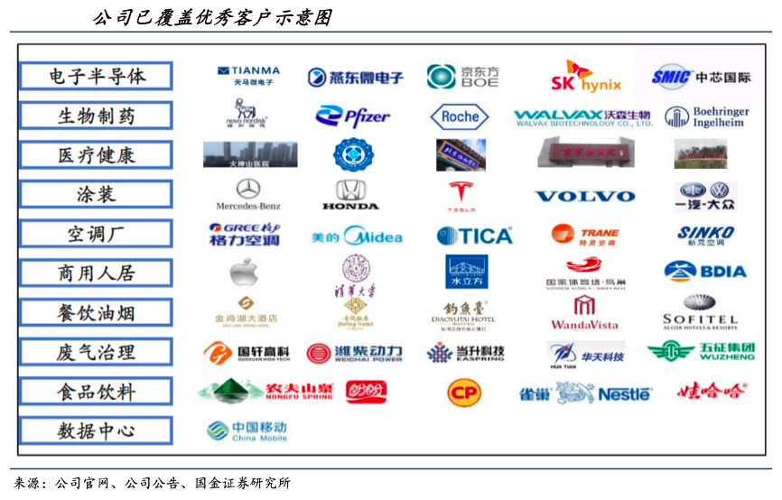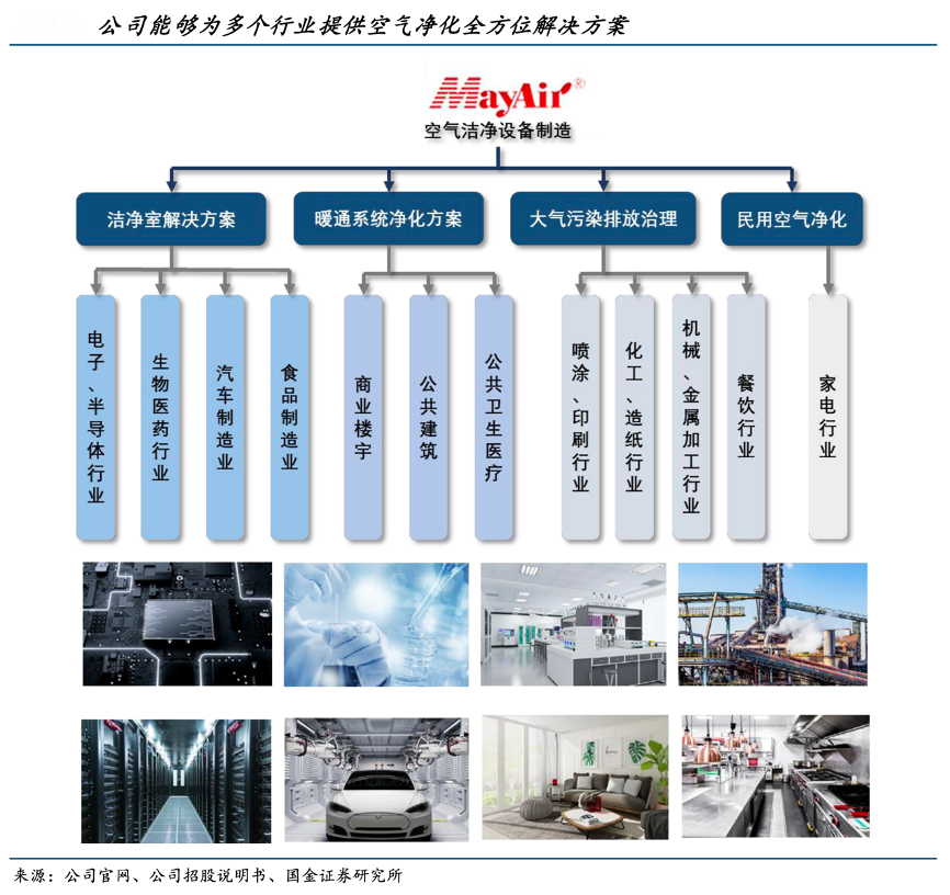 經(jīng)典案例:根據(jù)公司官網(wǎng)、公司招股說明書、國金證券研究所等綜合資訊表明,美埃科技公司產(chǎn)品下游涉及多行業(yè)場景。(1)FFU+過濾器應用于半導體、生物制藥、食品加工等行業(yè)的潔凈廠房及潔凈室中;(2)空氣凈化設備用于生物制藥產(chǎn)線(生物安全、無菌凈化設備)、室內(nèi)空氣凈化(商用、醫(yī)用、家用空氣凈化機)、工業(yè)生產(chǎn)(工業(yè)除塵設備/除油霧設備)、餐飲場景(除油煙凈化器)。