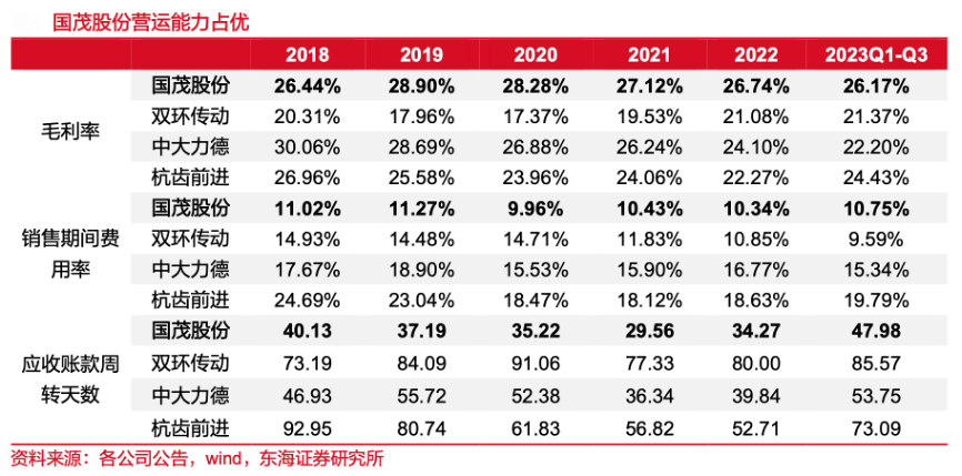經(jīng)典案例:根據(jù)各公司公告、wind、東海證券研究所等綜合資訊表明,國(guó)茂股份公司與主要競(jìng)爭(zhēng)對(duì)手相比,在盈利能力、費(fèi)用管控、收現(xiàn)速度等方面優(yōu)勢(shì)較為明顯。其應(yīng)收賬款周轉(zhuǎn)天數(shù)較低,主要系經(jīng)銷體系較優(yōu),經(jīng)銷商激勵(lì)及分級(jí)管理制度合理,確保應(yīng)收賬款保持高質(zhì)量。