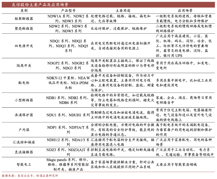 經(jīng)典案例:根據(jù)良信公眾號、財通證券研究所等綜合資訊表明,良信股份低壓電器產(chǎn)品種類齊全,下游覆蓋板塊廣泛。公司產(chǎn)品主要包括框架斷路器、塑殼斷路器、雙電源開關、隔離開關、終端類產(chǎn)品、工控類產(chǎn)品、配電柜等低壓電器以及部分中壓產(chǎn)品,業(yè)務覆蓋地產(chǎn)、通信、新能源、電網(wǎng)、工業(yè)制造等多個下游板塊。