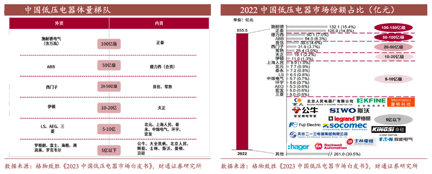 經(jīng)典案例:根據(jù)格物致勝《2023中國低壓電器市場白皮書》、財通證券研究所等綜合資訊表明,以正泰電器、良信股份為代表的內(nèi)資企業(yè),在地產(chǎn)、工業(yè) OEM 等領(lǐng)域繼續(xù)搶占外資市場份額,進一步壓縮中小品牌外資企業(yè)市場空間。施耐德電氣作為傳統(tǒng)的外資強勢品牌,通過能效管理和數(shù)字化在眾多下游行業(yè)賽道固守自己的領(lǐng)域和份額。