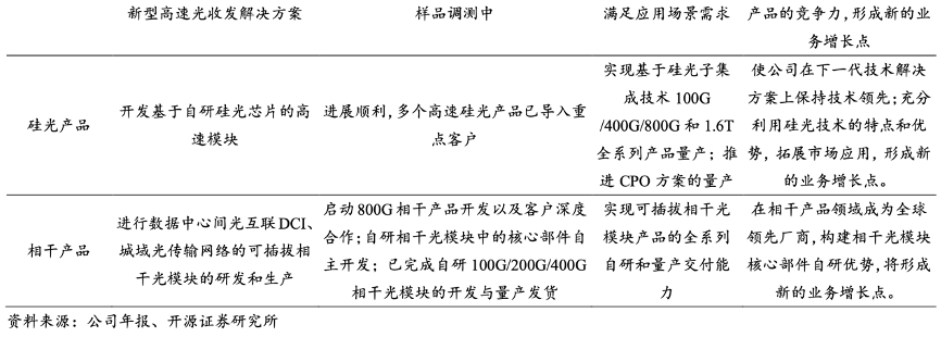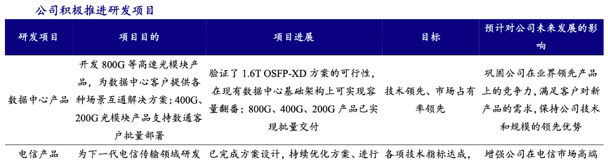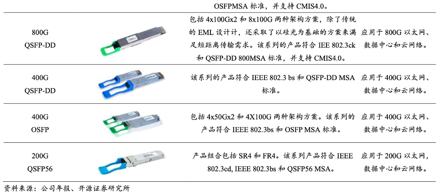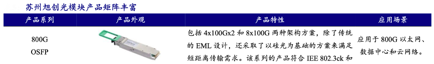 經(jīng)典案例:根據(jù)公司年報、開源證券研究所等綜合資訊表明,蘇州旭創(chuàng)致力于高端光通信收發(fā)模 塊的研發(fā)、設(shè)計、封裝、測試和銷售,產(chǎn)品服務(wù)于云計算數(shù)據(jù)中心、數(shù)據(jù)通信、 5G 無線網(wǎng)絡(luò)、電信傳輸和固網(wǎng)接入等領(lǐng)域的國內(nèi)外客戶。公司注重技術(shù)研發(fā),并推動 產(chǎn)品向高速率、小型化、低功耗、低成本方向發(fā)展,為云數(shù)據(jù)中心客戶提供 100G、 200G、400G 和 800G 的高速光模塊。