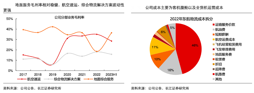 經(jīng)典案例:根據(jù)公司公告、長江證券研究所等綜合資訊表明,東航物流公司從毛利率看,因航空速運、綜合物流解決方案承擔(dān)空運干線運輸,利潤跟隨運價波動,盈利周期性較強(qiáng),2020 年以來,航空速運、綜合物流毛利率維持在較高水平。地面綜合服務(wù)以貨站收入為主,公司卡位布局核心貨站資源,穩(wěn)定賺機(jī)場貨量增長的錢,毛利率通常穩(wěn)定維持在 35%以上。