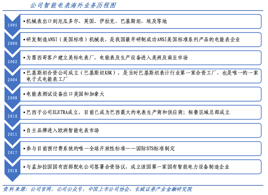 經(jīng)典案例:根據(jù)公司官網(wǎng)、公司公眾號、中國上市公司協(xié)會、長城證券產(chǎn)業(yè)金融研究院等綜合資訊表明,在渠道方面,海興電力公司電能表陸續(xù)打入美洲、亞洲、歐洲、非洲市場,并積極在當?shù)亟◤S、成立子公司等實現(xiàn)本土化生產(chǎn)和銷售。公司對海外市場的戰(zhàn)略重視和持續(xù)投入讓公司海外市場每一步的拓展都處于領(lǐng)先位置,具備極強先發(fā)優(yōu)勢。