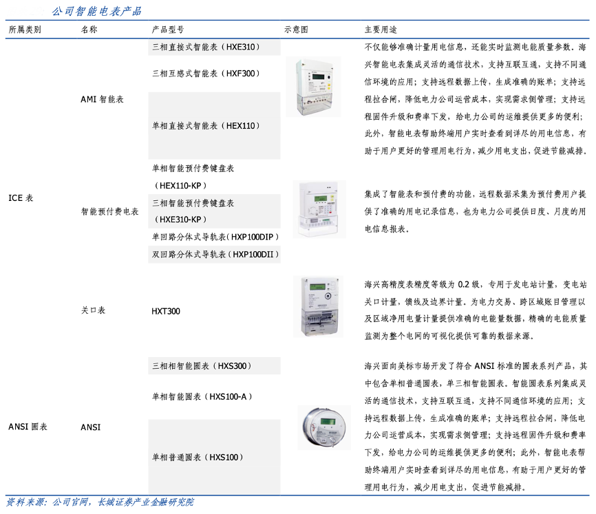 經(jīng)典案例:根據(jù)公司官網(wǎng)、長城證券產(chǎn)業(yè)金融研究院等綜合資訊表明,海興電力在產(chǎn)品類別方面,業(yè)務(wù)涵蓋 AMI 智能表、智能預(yù)付費(fèi)電表、關(guān)口表等,具體可進(jìn)一步分為包括單相電能表、三相 電能表、高精度表、預(yù)付費(fèi)鍵盤表、分體式導(dǎo)軌表等細(xì)分產(chǎn)品,覆蓋不同應(yīng)用領(lǐng)域,滿足各國不同電力客戶在電力計(jì)量產(chǎn)品方面的需求。