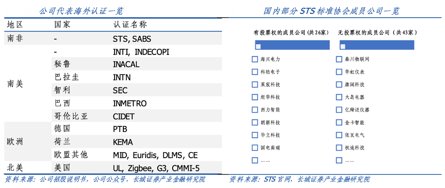 經(jīng)典案例:根據(jù)公司招股說明書、公司公眾號、STS官網(wǎng)、長城證券產(chǎn)業(yè)金融研究院等綜合資訊表明,海興電力獲得了多個國際認證,其中包括 德國 PTB 認證、歐盟 MID 認證等各種國際常規(guī)認證,是國內(nèi)最早成功研制 ANSI 美國標準系列產(chǎn)品的企業(yè)之一、是國內(nèi)最早成功研發(fā)歐洲智能電表標準的企業(yè)之一、也是我國獲得國際認證較多的智能電表企業(yè)之一。同時,2017 年海 興參與全球工人的預付費系統(tǒng)開放標準——國際 STS 標準的制定,Vending 系統(tǒng)成功通 過 STS 認證測試,成為國內(nèi)首家 STS 最新標準的 Vending 系統(tǒng)廠家,進一步夯實了其在海外市場的美譽。