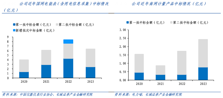經(jīng)典案例:根據(jù)中國儀器儀表行業(yè)協(xié)會、電力喵、長城證券產(chǎn)業(yè)金融研究院等綜合資訊表明,2019-2023 年,海興電力公司國網(wǎng)和南網(wǎng)中 標(biāo)金額呈快速增長態(tài)勢,2023 年度,公司國網(wǎng)和南網(wǎng)的中標(biāo)金額分別為 6.36 億元和 2.42 億元。此外,海興電力與兩網(wǎng)保持融 洽合作,于2022年參與國網(wǎng)電科院“一芯一系統(tǒng)”項目開發(fā),并相繼推出了面向海外市場和國內(nèi)市場的不同產(chǎn)品。