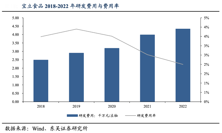 經(jīng)典案例:根據(jù)wind、東吳證券研究所等綜合資訊表明,寶立食品研發(fā)費(fèi)用從 2018 年到 2022 年逐年遞增,公司重視研發(fā)新品增加投入,致力于擴(kuò)充產(chǎn)品體 系,滿足 B 端客戶多樣需求,幫助提升產(chǎn)品多元性、制造差異、打造品牌競(jìng)爭(zhēng)力。