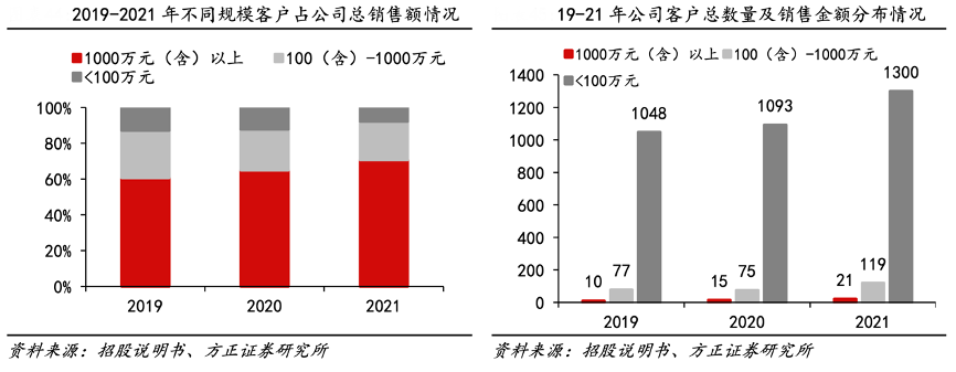經(jīng)典案例:根據(jù)招股說明書、方正證券研究所等綜合資訊表明,從寶立食品客戶擴(kuò)展數(shù)量來看,其大客戶(年銷售額 1000 萬元及以上)年均拓展 5.5 家,大客戶數(shù)量呈逐年上升趨勢,主要系公司基于對大客戶的服務(wù)能力及行業(yè)口碑,不斷拓展優(yōu)質(zhì)客戶的結(jié)果。該部分客戶銷售金額合計(jì)占公司主營業(yè)務(wù)收入的比例較高,各期均超過60%,集中度較高。