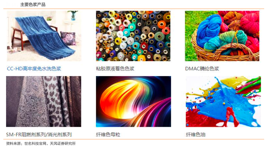 經(jīng)典案例:根據(jù)世名科技官網(wǎng)、天風(fēng)證券研究所等綜合資訊表明,2018年開(kāi)始,世名科技公司在持續(xù)優(yōu)化原有涂料類(lèi)、膠乳著色等產(chǎn)品技術(shù)的基礎(chǔ)上,逐步布局纖維 原液、紡織品綠色著色、特種添加劑等行業(yè)新產(chǎn)品。目前,纖維類(lèi)產(chǎn)品主要包含纖維原液 著色色漿、高性能母粒及功能性納米材料等產(chǎn)品,主要應(yīng)用于紡織纖維領(lǐng)域,基本實(shí)現(xiàn)了纖維原液著色技術(shù)及相關(guān)產(chǎn)品的全覆蓋。