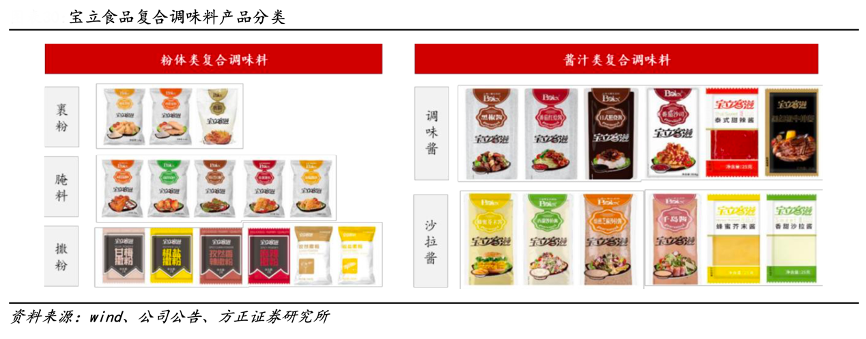 經(jīng)典案例:根據(jù)wind、公司公告、方正證券研究所等綜合資訊表明,寶立食品公司復(fù)合調(diào)味料產(chǎn)品主要可分為粉體和醬汁兩大類。醬汁類復(fù)合調(diào)味料主要包括調(diào)味醬、沙拉醬、調(diào)味油和調(diào)味汁等,可以 保持食物的原汁原味防止食物風(fēng)味因過度烹飪而喪失風(fēng)味。