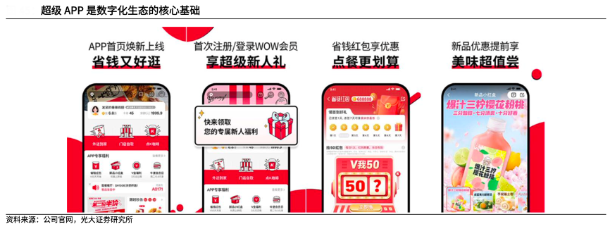 經(jīng)典案例:根據(jù)公司官網(wǎng)、光大證券研究所等綜合資訊表明,作為行業(yè)內(nèi)數(shù)字化創(chuàng)新先鋒,百勝中國于 2016 年陸續(xù)推出肯德基和必勝客的超級(jí) Apps,成為首批向顧客提供移動(dòng)化支付的連鎖餐廳之一。超級(jí) App 支持支付 寶、微信支付和神錢包等支付方式,隨著移動(dòng)支付普及程度的提高和消費(fèi)者習(xí)慣的改變,數(shù)字化支付占公司銷售額的比例逐年提高,由 2016 年的 33%提升至 2022 年的 99%。