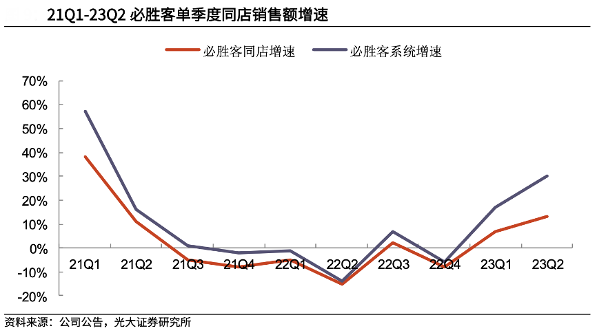經(jīng)典案例:根據(jù)公司公告、光大證券研究所等綜合資訊表明,2018 年 12 月必勝客在全國范圍內(nèi)推 出“尖叫星期三”長期優(yōu)惠活動,在每周三都給予特定產(chǎn)品優(yōu)惠的價格, 品類包括牛排、披薩、甜品等。2020年必勝客在“30 周年”之際推出經(jīng) 典產(chǎn)品 9 元起、半價過“五一”等活動。2023年為慶祝開業(yè) 3000 家店,必勝客連續(xù) 5 天推出“69 元兩件產(chǎn)品”。隨著防疫政策逐步優(yōu)化,23Q1 以來必勝客單季度同店銷售額增速持續(xù)回升。