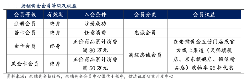 經(jīng)典案例:根據(jù)老鋪黃金招股書、老鋪黃金會(huì)員中心微信小程序、信達(dá)證券研究開發(fā)中心等綜合資訊表明,老鋪黃金公司會(huì)員分為四大等級(jí),任意消費(fèi)即可成為忠誠會(huì)員,累計(jì)正價(jià)商品消費(fèi)金額達(dá)到 30 萬元 即為高級(jí)忠誠會(huì)員,可享受官方購買渠道 95 折的優(yōu)惠權(quán)益。