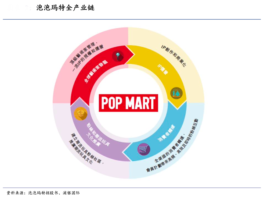 經(jīng)典案例:根據(jù)泡泡瑪特招股書、浦銀國際等綜合資訊表明,作為中國最大的平臺型潮玩 IP 企業(yè),泡泡瑪特是目前少數(shù)參與藝術家 IP 早 期孵化和培育過程,并覆蓋 IP 全產(chǎn)業(yè)鏈的潮玩玩家。