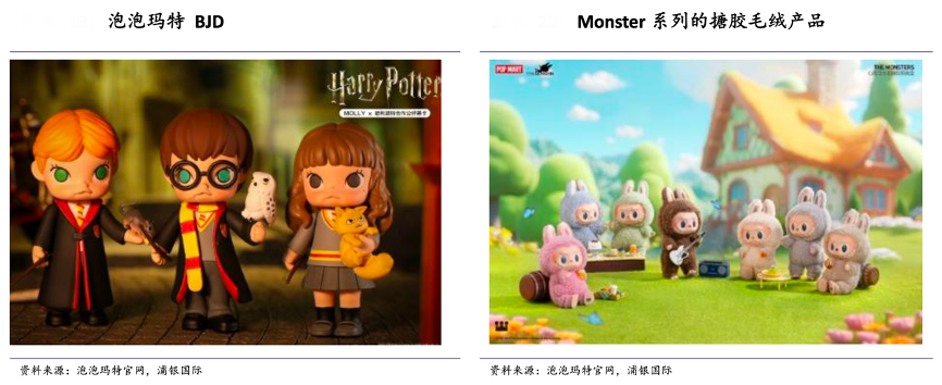 經(jīng)典案例:根據(jù)泡泡瑪特官網(wǎng)、浦銀國(guó)際等綜合資訊表明,泡泡瑪特基于旗下主要藝術(shù)家 IP(包括 Molly 和 SP)所推出的 BJD 娃娃產(chǎn)品,市場(chǎng)反響良好。公司近年還涉足了搪膠毛絨公仔的領(lǐng)域,其推出的 Monster 系列的搪膠毛絨產(chǎn)品受到了消費(fèi)者的廣泛歡迎,并成為爆品。
