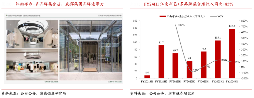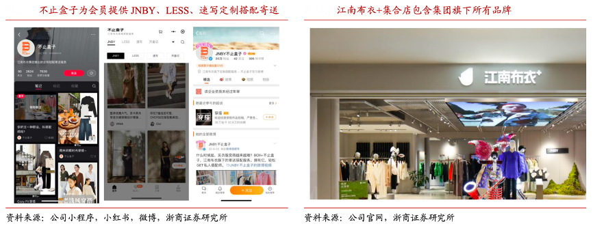 經(jīng)典案例:根據(jù)公司官網(wǎng)、公司小程序、小紅書、微博、浙商證券研究所等綜合資訊表明,江南布衣公司推出江南布衣+多品牌集合店等新興消費場景和產(chǎn)品,通過“不止盒子私人搭配”、“跨品牌會員權(quán)益”、“免運費寄送”、“服裝高端洗護”等會員專屬體驗的消費場景,加強粉絲粘性。FY2023H2、FY2024H1 江南布衣+集合店收入同比分別+119%、+85%至 1.05、 1.38 億元,彰顯集團品牌連帶力與新渠道的快速增長。