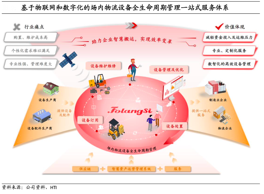 經(jīng)典案例:根據(jù)公司資料、HTI等綜合資訊表明,佛朗斯是一家基于物聯(lián)網(wǎng)和數(shù)字化驅動的中國場內(nèi)物流設備全生命周期解決方案提供商,為企業(yè)提供場內(nèi)物流設備使用和管理的一站式解決方案,該解決方案覆蓋設備的全生命周期,包括設備訂用、維護維修、處置等環(huán)節(jié)。同時,公司建有智慧資產(chǎn)運營管理系統(tǒng),為客戶建立了“線上+線下”的全方位服務網(wǎng)絡,實現(xiàn)了便捷一體化的設備服務管理能力。