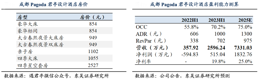 經(jīng)典案例:根據(jù)公司公告、遇君亭微信公眾號(hào)、東吳證券研究所等綜合資訊表明,成都 Pagoda 開(kāi)業(yè)以來(lái)獨(dú)特的設(shè)計(jì)風(fēng)格吸引大量顧客 打卡,小紅書(shū)上成都 Pagoda 酒店 tag 熱度達(dá) 17 萬(wàn)次瀏覽。2023 年 H1,成都 Pagoda 實(shí) 現(xiàn)營(yíng)業(yè)收入 2596.24 萬(wàn)元,RevPAR 為 702 元,同比+108%,凈利潤(rùn)為 515.04 萬(wàn)元,凈 利率為 19.8%。