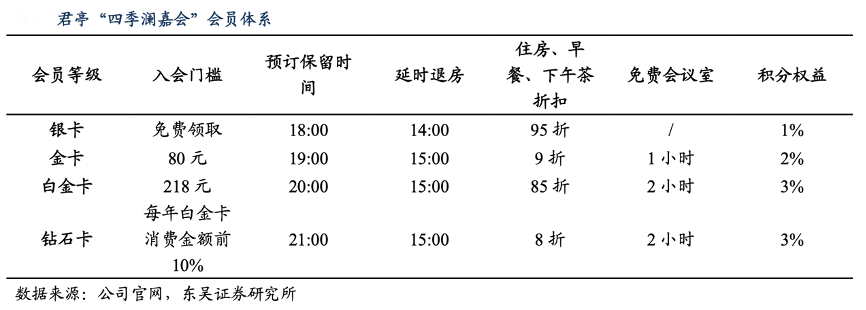 經(jīng)典案例:根據(jù)公司官網(wǎng)、東吳證券研究所等綜合資訊表明,會(huì)員體系方面,君亭酒店“四季瀾嘉會(huì)”會(huì)員體系已基本建成,會(huì)員等級(jí)分為銀卡、金卡、白金卡以及鉆石卡,在預(yù)定、退房以及折扣權(quán)益方面給予不同優(yōu)惠。憑借完善的會(huì)員體系,為公司積累大量忠誠客戶,截至 2023 年 11 月,會(huì)員總數(shù)已達(dá) 570 萬。