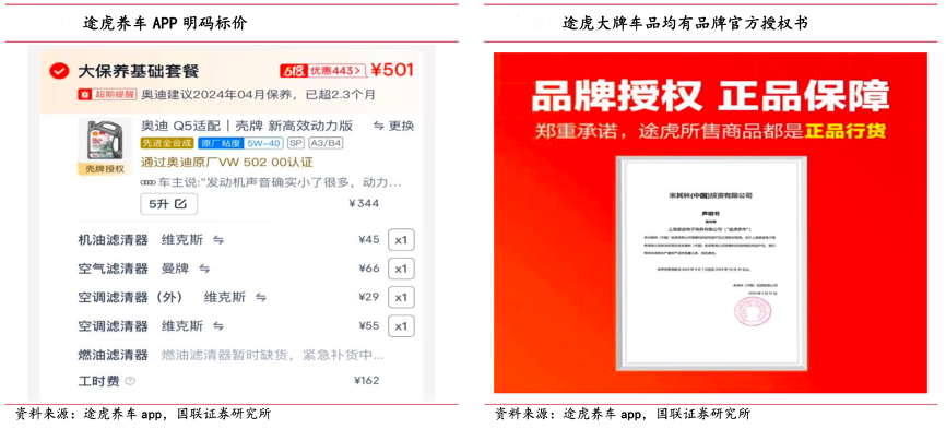 經(jīng)典案例:根據(jù)途虎養(yǎng)車(chē)app、國(guó)聯(lián)證券研究所等綜合資訊表明,途虎的線上銷(xiāo)售預(yù)約+線下標(biāo)準(zhǔn)化服務(wù)的創(chuàng)新養(yǎng)車(chē)模式上解決了傳統(tǒng) IAM 產(chǎn)品/服務(wù)價(jià)格不透明的痛點(diǎn),也省 去了討價(jià)還價(jià)的過(guò)程,用戶(hù)通過(guò)線上 app 可以詳細(xì)了解所有項(xiàng)目的具體收費(fèi)情況。此外用戶(hù)通過(guò) APP 綁定愛(ài)車(chē)后,系統(tǒng)會(huì)根據(jù)車(chē)型推薦適合的配件,相較于綜合網(wǎng)購(gòu)平臺(tái)節(jié)省了產(chǎn)品橫線對(duì)比時(shí)間。在產(chǎn)品方面,途虎在售的大牌車(chē)品均有品牌的官方授權(quán)書(shū)。