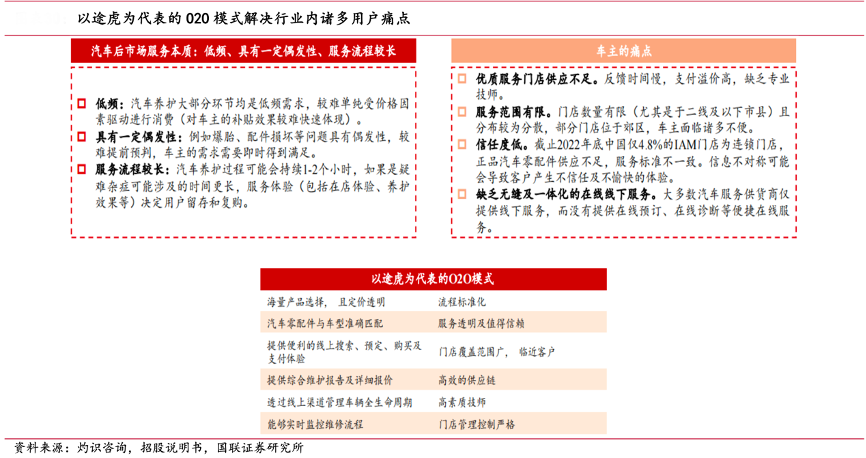 經(jīng)典案例:根據(jù)灼識(shí)咨詢(xún)、招股說(shuō)明書(shū)、國(guó)聯(lián)證券研究所等綜合資訊表明,以途虎為代表的 O2O 模式解決汽車(chē)后市場(chǎng)諸多用戶(hù)痛點(diǎn)。O2O汽車(chē)服務(wù)模式將線 上平臺(tái)及線下門(mén)店的優(yōu)點(diǎn)相結(jié)合,線上平臺(tái)為線下運(yùn)營(yíng)提供龐大的客戶(hù)流量及數(shù)據(jù)分析;線下門(mén)店與集中式供應(yīng)鏈系統(tǒng)合作,采用統(tǒng)一的數(shù)字化客戶(hù)管理及訂單系統(tǒng),并且線下門(mén)店受到平臺(tái)的實(shí)時(shí)嚴(yán)格管控。