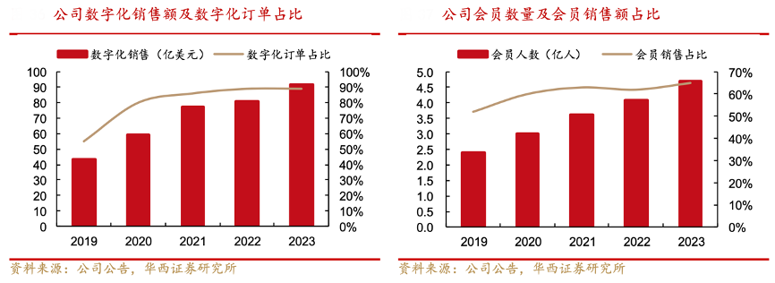 經典案例:根據公司公告、華西證券研究所等綜合資訊表明,肯德基和必勝客分別于 2015 年和 2017 年推出官方 APP, 2023 年,公司數字點餐金 額超 90 億美元,數字訂單占比約 89%;截至 2023 年底,肯德基及必勝客會員計劃共 擁有超 4.7 億會員,2023 年會員銷售額占系統(tǒng)銷售額約 65%。