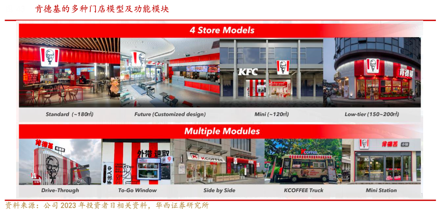 經典案例:根據公司2023年投資者日相關資料、華西證券研究所等綜合資訊表明,肯德基目前具有標準店、未來店、Mini 店和下沉市場店 4 種門店模式;其中,Mini 店面積小(單店約 120 平方 米,vs 標準店 180 平方米),投資成本約比標準店低三分之一,主要用于高線城市的門店加密;下沉市場店門店在 150-200 平米之間,通過設備和裝修的優(yōu)化降低投資成本。