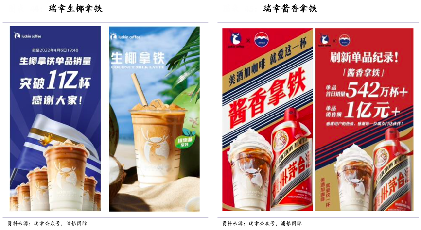 經(jīng)典案例:根據(jù)瑞幸公眾號、浦銀國際等綜合資訊表明,瑞幸無疑是現(xiàn)制咖啡產(chǎn)品創(chuàng)新的先鋒和領(lǐng)導(dǎo)者。為了迎合這部分年輕人的口味,瑞幸于 2021 年 4 月推出了爆款產(chǎn)品——生椰拿鐵,在現(xiàn)制咖啡行業(yè)中制造了巨大的聲浪。2023 年 9 月,瑞幸跨界開啟與茅臺的合作,將茅臺產(chǎn)品融入咖啡,推出醬香拿鐵產(chǎn)品。醬香拿鐵的話題在社交媒體上持續(xù)傳播,迅速成為網(wǎng)絡(luò)熱搜的焦點。