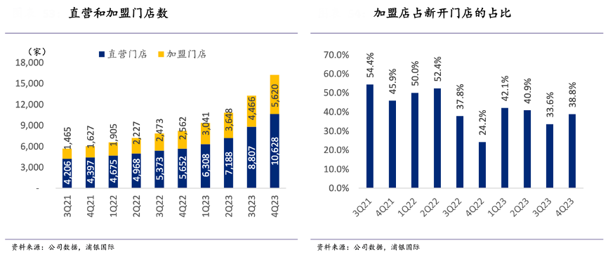 經(jīng)典案例:根據(jù)公司數(shù)據(jù)、浦銀國際等綜合資訊表明,基于咖啡行業(yè)在低線城市巨大的市場需求,瑞幸確定了以聯(lián)營模式、依托加 盟商在當(dāng)?shù)氐膬?yōu)質(zhì)資源向下沉市場拓張的戰(zhàn)略。過去三年里,瑞幸的加盟商門店數(shù)的增速遠(yuǎn)高于直營門店數(shù)。這意味著瑞幸正積極地向低線市場進(jìn)行滲透。截至 2023 年末,瑞幸加盟門店數(shù)已經(jīng)占到公司整體門店數(shù)的 34.6%。
