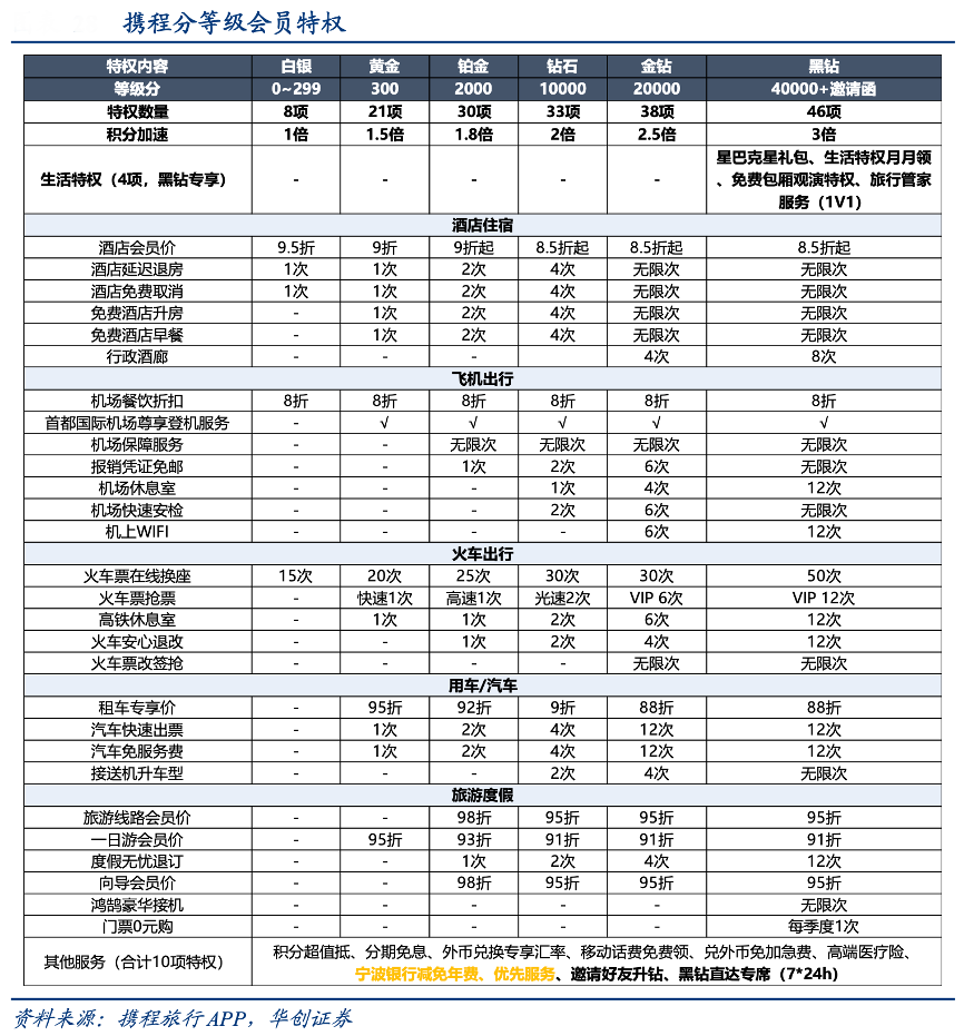 經(jīng)典案例:根據(jù)攜程旅行APP、華創(chuàng)證券等綜合資訊表明,攜程目前擁有超 4 億會(huì)員,其會(huì)員特權(quán)在不斷跟酒店機(jī)場(chǎng)合作下逐漸豐富,包括延遲退房、機(jī)場(chǎng)休息室、快速 登機(jī)服務(wù)等,黑鉆已擁有 46 項(xiàng)特權(quán),包括 4 項(xiàng)專屬生活特權(quán)——星巴克星禮包、生活特權(quán)月月領(lǐng)、免費(fèi)包廂觀演特權(quán)、旅行管家服務(wù)(1V1)。