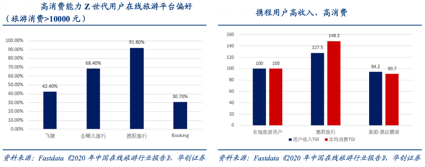 經(jīng)典案例:根據(jù)Fastdata《2020年中國(guó)在線旅游行業(yè)報(bào)告》、華創(chuàng)證券等綜合資訊表明,攜程以服務(wù)中心模式起家,多年來公司堅(jiān)持自營(yíng)客服呼叫中心,并引用 6 西格瑪標(biāo)準(zhǔn)保證呼叫中心的質(zhì)量標(biāo)準(zhǔn),同時(shí)其在前互聯(lián)網(wǎng)時(shí)代,線下發(fā)卡、地推、高效解決的服務(wù)為攜程贏得并積累了一批優(yōu)質(zhì)商旅用戶,根據(jù) Fastdata 數(shù)據(jù),攜程用戶收入 TGI 均高于行業(yè)平均,且高消費(fèi)能力 Z 世代也更偏向 于使用攜程和去哪兒。