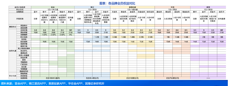 經(jīng)典案例:根據(jù)亞朵APP、錦江酒店APP、首旅如家APP、華住會APP、國海證券研究所等綜合資訊表明,亞朵A-Card會員權(quán)益跳出傳統(tǒng)酒店場景,延伸至出行、閱讀、會議、餐飲以及新零售等多個生活場景,可滿足更多元的消費(fèi)需求。亞朵的A-Card會員除會員積分、 會員價格、預(yù)定保留、延遲退房等傳統(tǒng)酒店權(quán)益外,還可以享受多項(xiàng)區(qū)別于其余四家酒店會員的獨(dú)特禮遇,如書籍借閱、門店活動、會議室、專屬管家、酒廊使用權(quán) 等。