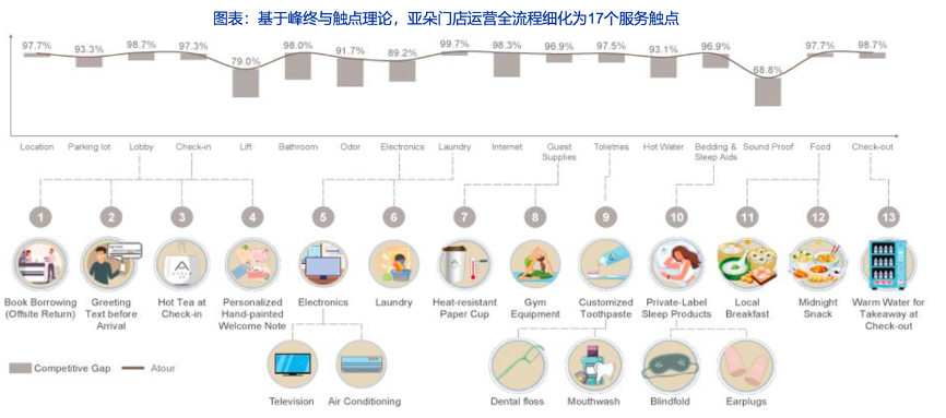 經(jīng)典案例:根據(jù)公司招股書、國海證券研究所等綜合資訊表明,亞朵服務(wù)以峰終觸點(diǎn)為底層理論,將門店從預(yù)定到退房的運(yùn)營全流程細(xì)分為17個服務(wù)觸點(diǎn),為用戶提供了遠(yuǎn)超 同行的入住體驗(yàn),根據(jù)Brand Wisdom調(diào)研數(shù)據(jù)顯示,亞朵在17個觸點(diǎn)中均獲得行業(yè)最高的用戶好評率。