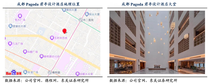 經(jīng)典案例:根據(jù)公司官網(wǎng)、攜程網(wǎng)、東吳證券研究所等綜合資訊表明,成都 Pagoda 于 2022 年 3 月 開業(yè),屬“Pagoda 君亭”品牌西南布局首店,其處于春熙路商圈,距離 成都時尚中心——太古里僅 5 分鐘步程。成都 Pagoda 大堂結(jié)合現(xiàn)代 AR 交互技術(shù),展示林俊廷先生作品《鎏瑩》,中庭采用獨特孔明燈設(shè)計,營造中式設(shè)計氛圍。