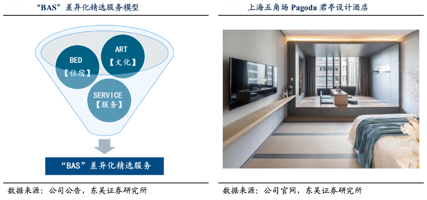 經(jīng)典案例:根據(jù)公司公告、公司官網(wǎng)、東吳證券研究所等綜合資訊表明,君亭首創(chuàng)“BAS”模式,提供差異化精選服務(wù)。“BAS”模型即“Bed 住宿+Art 文化 藝術(shù)+ Service 服務(wù)”三位一體,以產(chǎn)品為基礎(chǔ),不斷提升品牌及體驗。君亭立足于“BAS” 模式,形成“產(chǎn)品精選、文化精選及服務(wù)內(nèi)容精選”的君亭特色服務(wù)體系。