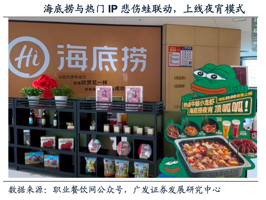 經(jīng)典案例:根據(jù)職業(yè)餐飲網(wǎng)公眾號(hào)、廣發(fā)證券發(fā)展研究中心等綜合資訊表明,2023年暑期海底撈近1000家門(mén)店每晚上線(xiàn)夜宵,增加小龍蝦、鹵味、牛蛙鍋、精釀啤酒等產(chǎn)品,聯(lián)動(dòng)熱門(mén)IP悲傷蛙,每晚定時(shí)發(fā)起猜拳活動(dòng)。