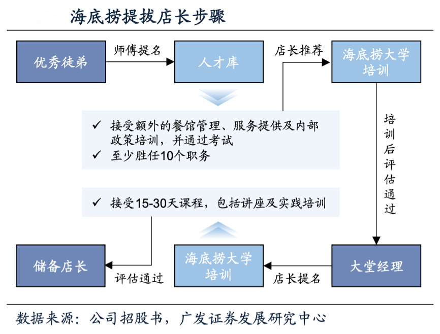 經(jīng)典案例:根據(jù)公司招股書、廣發(fā)證券發(fā)展研究中心等綜合資訊表明,海底撈公司注重人才培養(yǎng)和儲(chǔ)備,店長(zhǎng)可提拔優(yōu)秀的大堂經(jīng)理接受海底撈大 學(xué)的店長(zhǎng)培訓(xùn),通過后即可成為儲(chǔ)備店長(zhǎng),待有合適的新餐廳開業(yè)時(shí),儲(chǔ)備店長(zhǎng)即 可被提拔為店長(zhǎng),員工晉升為店長(zhǎng)約需4年。