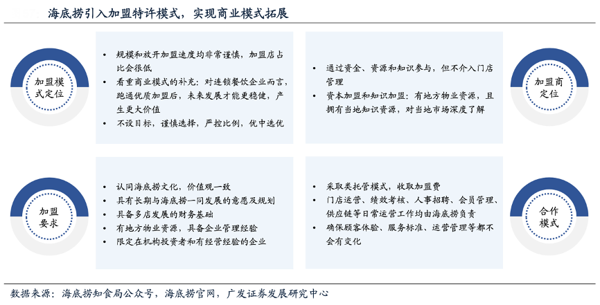 經(jīng)典案例:根據(jù)海底撈知食局公眾號(hào)、海底撈官網(wǎng)、廣發(fā)證券發(fā)展研究中心等綜合資訊表明,海底撈引入加盟特許模式,實(shí)現(xiàn)商業(yè)模式拓展。